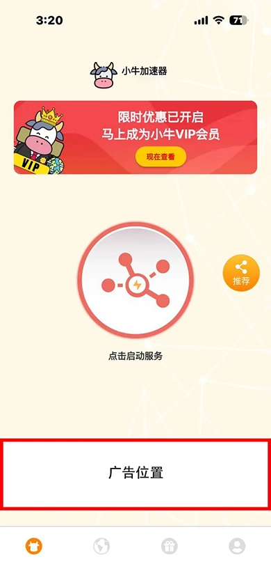 小牛加速器为全球用户提供免费 VPN 服务。为了覆盖免费位置的服务器成本,我们在应用程序内为免费用户提供广告,如下截图所示。